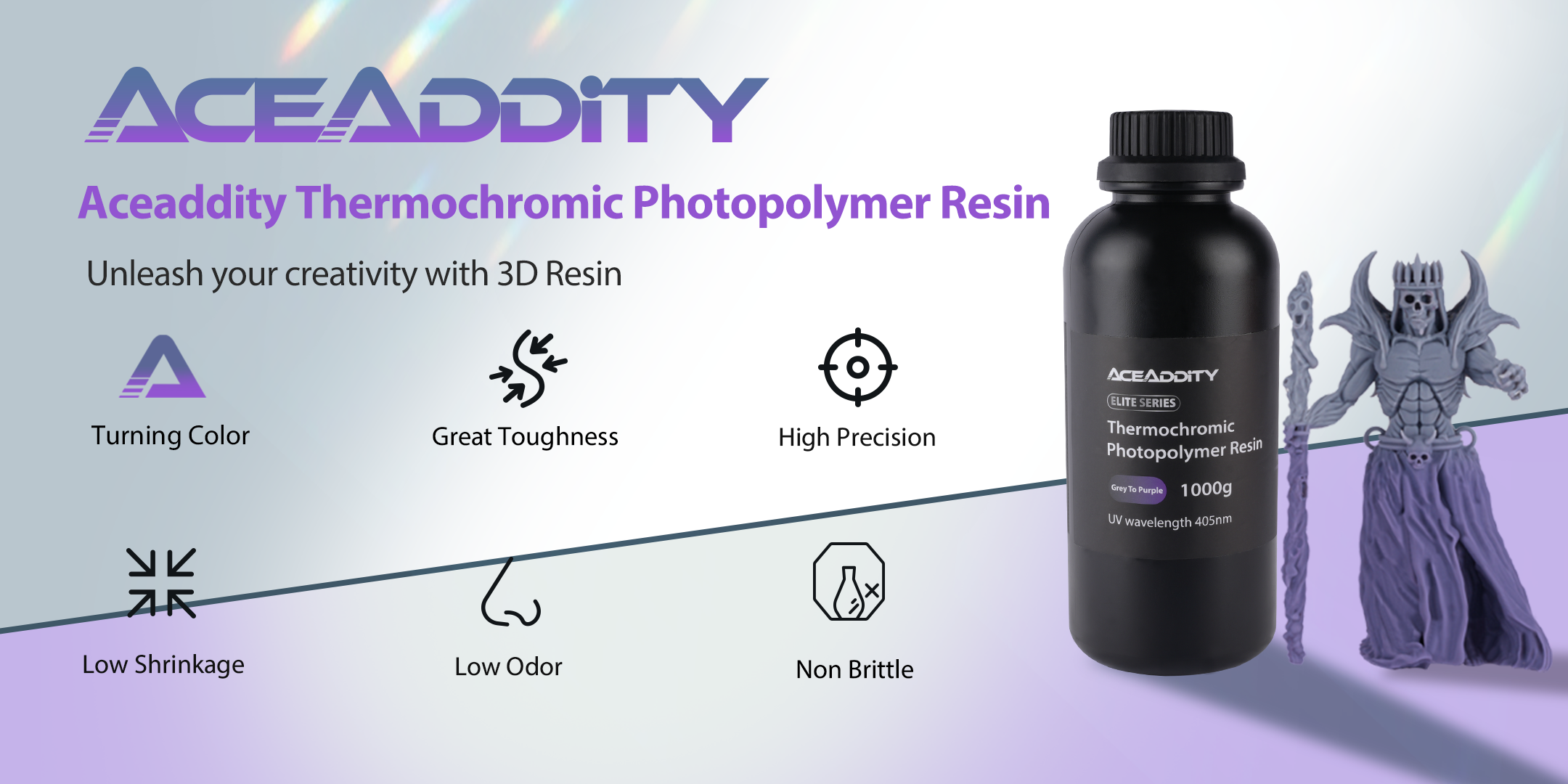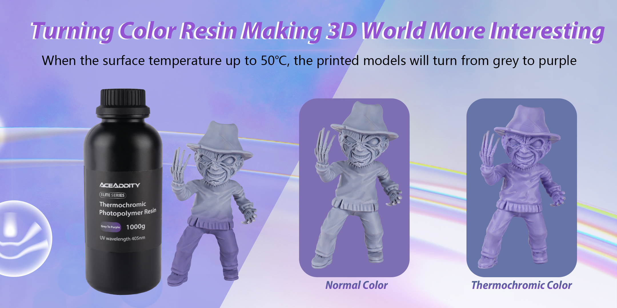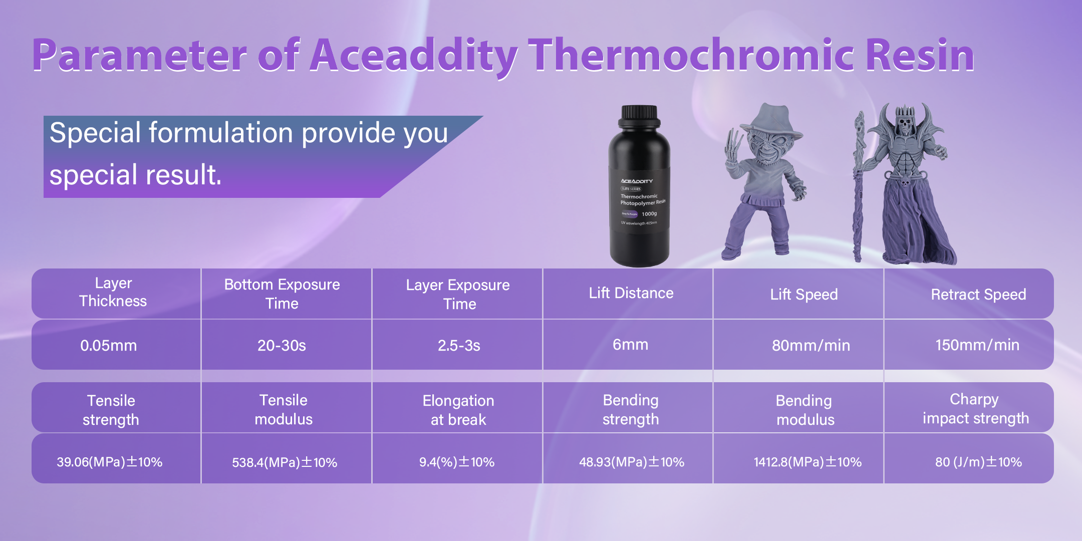 - Thermochromic Resin: Changes color at 50°C (Grey to Purple).