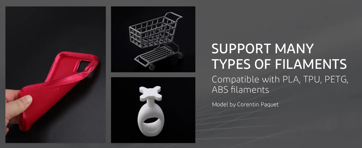 - Filament compatibility: PLA, ABS, TPU, PETG, Wood, Marble, etc