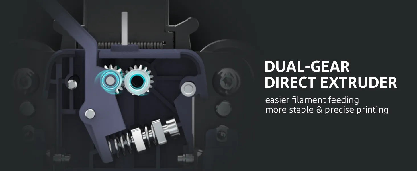 - [Dual-Gear Direct Extruder] The new dual-gear direct drive extruder is made of SUS303 high-quality stainless steel with a 3:1 reduction ratio and stronger extrusion force for smoother filament feeding and more stable & accurate printing, which greatly reduces nozzle clogging and under-extrusion issues, printing effect is better than Bowden extruder.